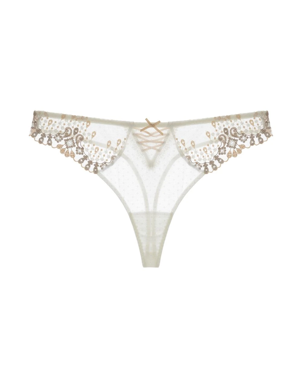 Don’t let the delicate details of this thong fool you, the Joyeau Eternal Tanga is surely mesmerizing. All-over Swiss dotted tulle combined with Swiss embroidery to surround your curves with minimal rear coverage. Paired with satin ribbons in the front and back for a luxe detail whenever you wear it.