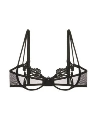 Some things are best left to the imagination and some things are best when covered by exquisite strapping details and boldly luxe panels of guipure stitchery. This open-cupped peek-a-boo bra is, obviously, one of the latter. The close-set totally ouvert cups are embellished with perfectly placed floral appliqués that perfectly frame the bust, finishing with a trio of slender, bondage-inspired straps, a tulle mesh band, and a diamante at the center spacer. Bold, just like we like it.