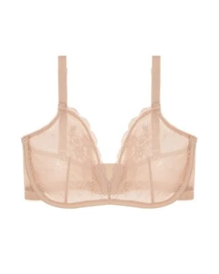 Unlined semi-sheer floral mesh triangle cups. Underwire, adjustable straps and hook and eye closure.