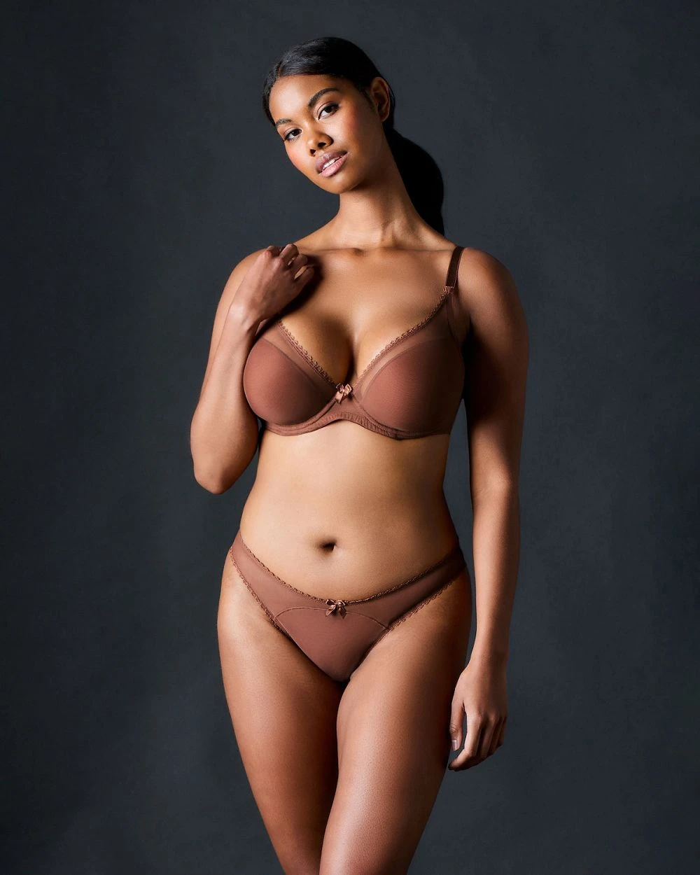Back to basics with the Victoire Plunge Bra. This must-have everyday style is made with demi style cups and a mesh overlay to create a plunge underwire bra style. The mesh panels and wings are complimented with eyelash trim and adjustable straps and a hook and eye closure for an easy fit.