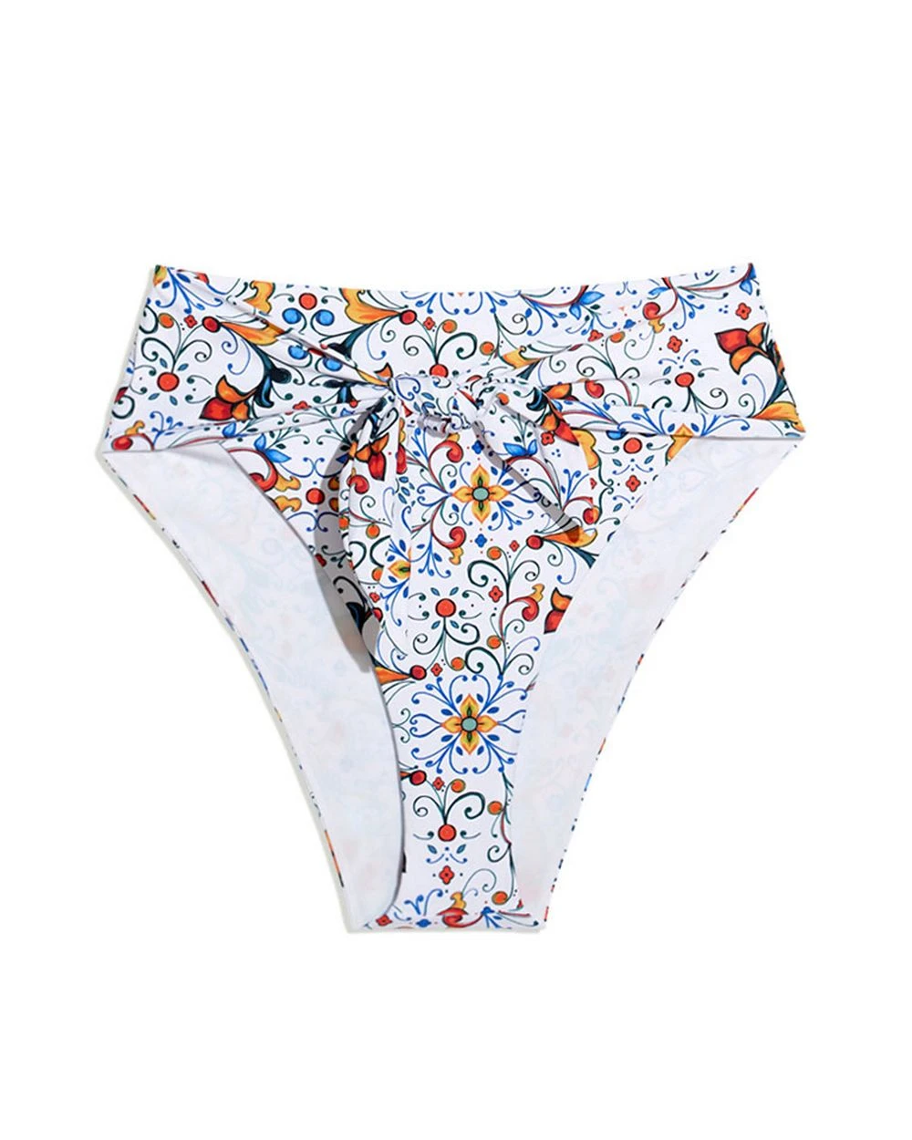 With its delicious Mediterranean-inspired prints, sublime high-waist shape, and glamorous dipped tie-front, this stunner is a refreshing, playa-ready change from the ordinary. Summer flings, right this way.